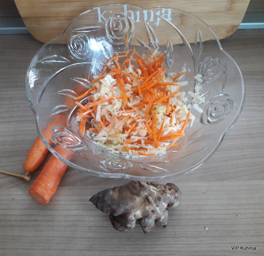 Topinambur se poleg kuhanega ali pečenega uživa tudi surovega. Iz njega si lahko naredite solato, jaz sem ga kombinirala s korenjem ter kislim zeljem, ki sem ga splaknila pod vodo.